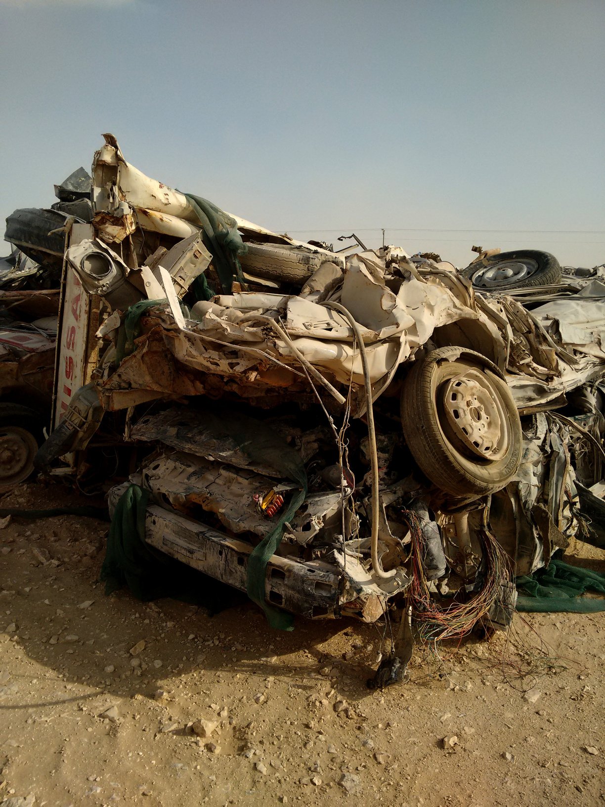 The limited quality of my smartphone camera here is not as bad as in my wandering through other parts of Qatar, perhaps because of the hard desert light. Someone would later suggest that one of the photos with the tires looks like an oil painting. The partly disassembled crashed cars and parts may also be read as large sculptures indicating a stalled time. Those things won't degrade naturally anytime soon. They might as well outlive the human species in the planet.